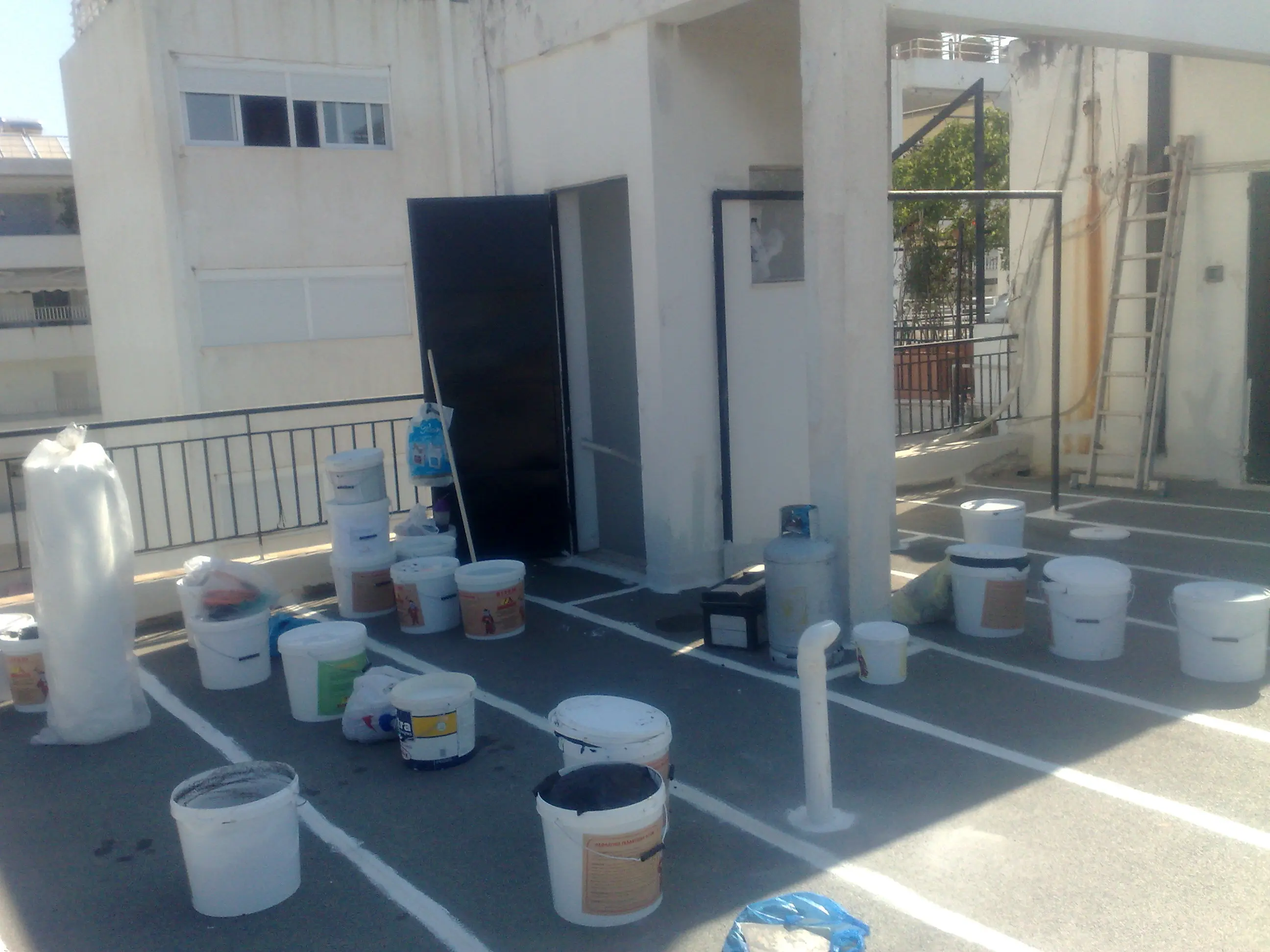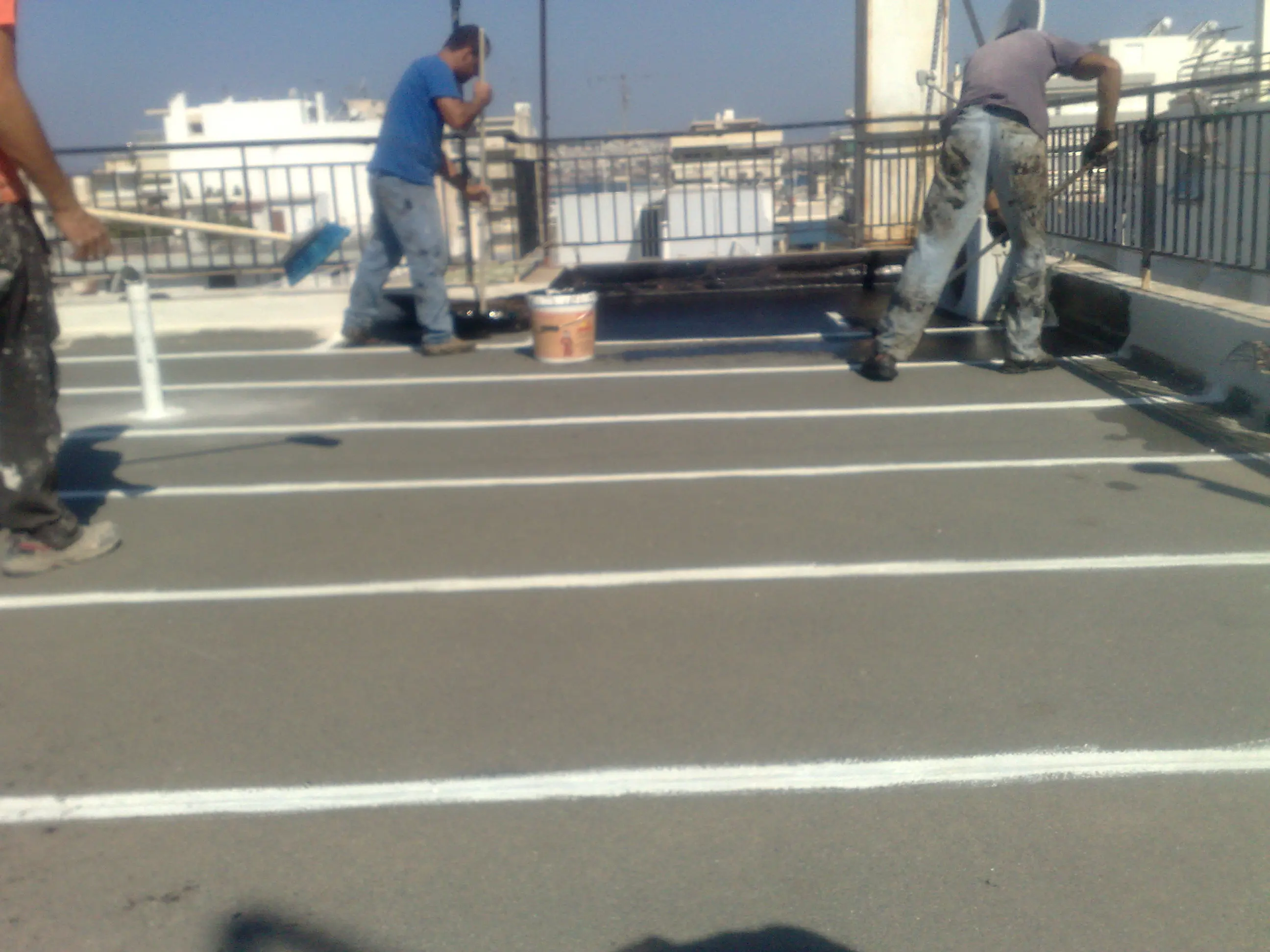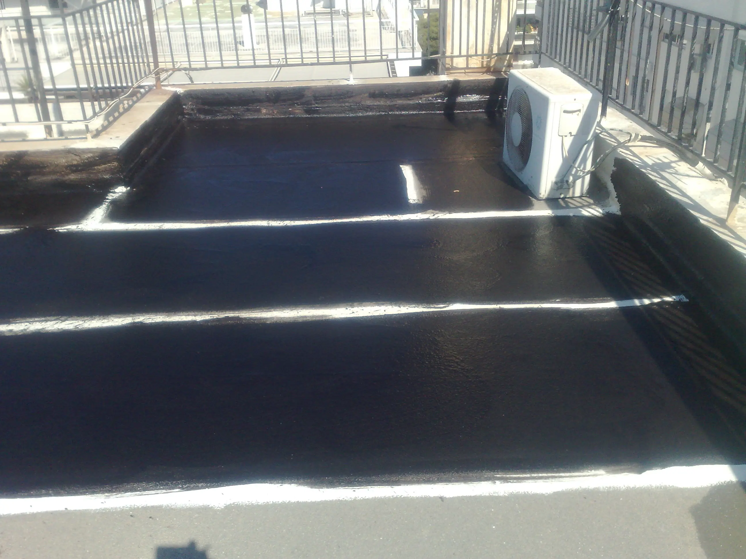 Η εργασια αφορα συντηρηση και επισκευη παλαιας στεγανωσης με ασφαλτοπανα στην περιοχη της Γλυφαδας. Εγινε επικολληση της παλαιας μονωσης με φλογιστρα, τοποθετηθηκαν αεραγωγοι φ 100, μαστιχα σε αρμους και φύλλα εμποτισμου με ασφαλτικο πολτο για καλυψη των ασφαλτοπανων. Τελικη μορφη με αλουμινιο ρευστο.