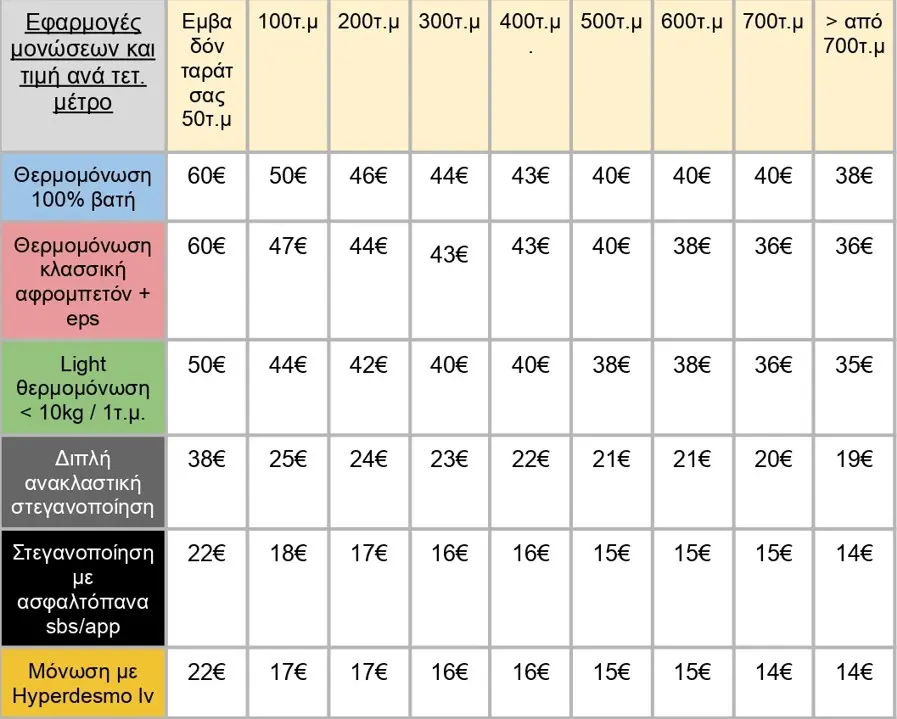 επισκευές σε μεγάλες σαθρές επιφάνειες. Οι τιμές στις θερμομονώσεις αναφέρονται σε eps & xps αντίστοιχα με πάχος 7cm.